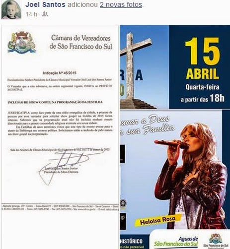 Mas a programação do "festival gospel" a ser realizado no dia do aniversário da cidade foi definida pelo próprio prefeito Luiz Zera (PP) no dia 3 de março, garante uma fonte da Administração Municipal. Ou seja, 14 dias antes do pedido de Joel.